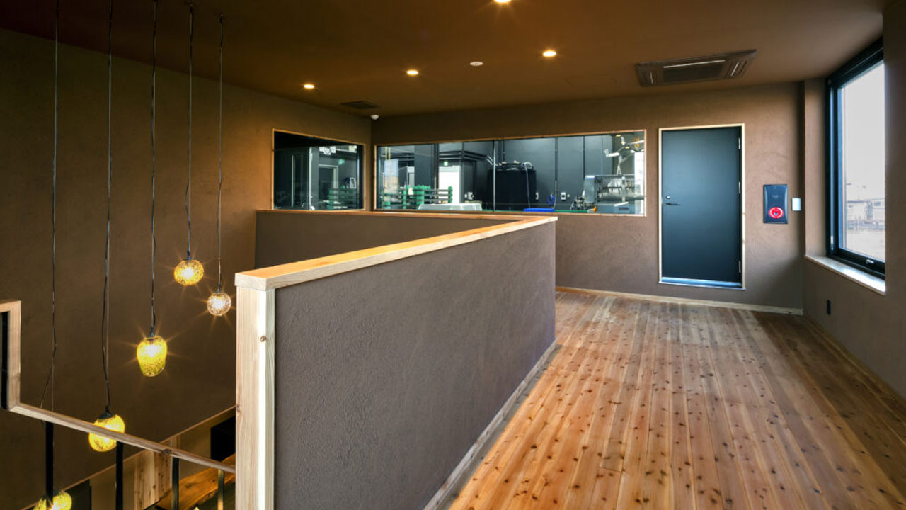 1階の直売コーナーや2階の見学スペースの内装は、スギと土壁の色や質感が調和したデザイン。